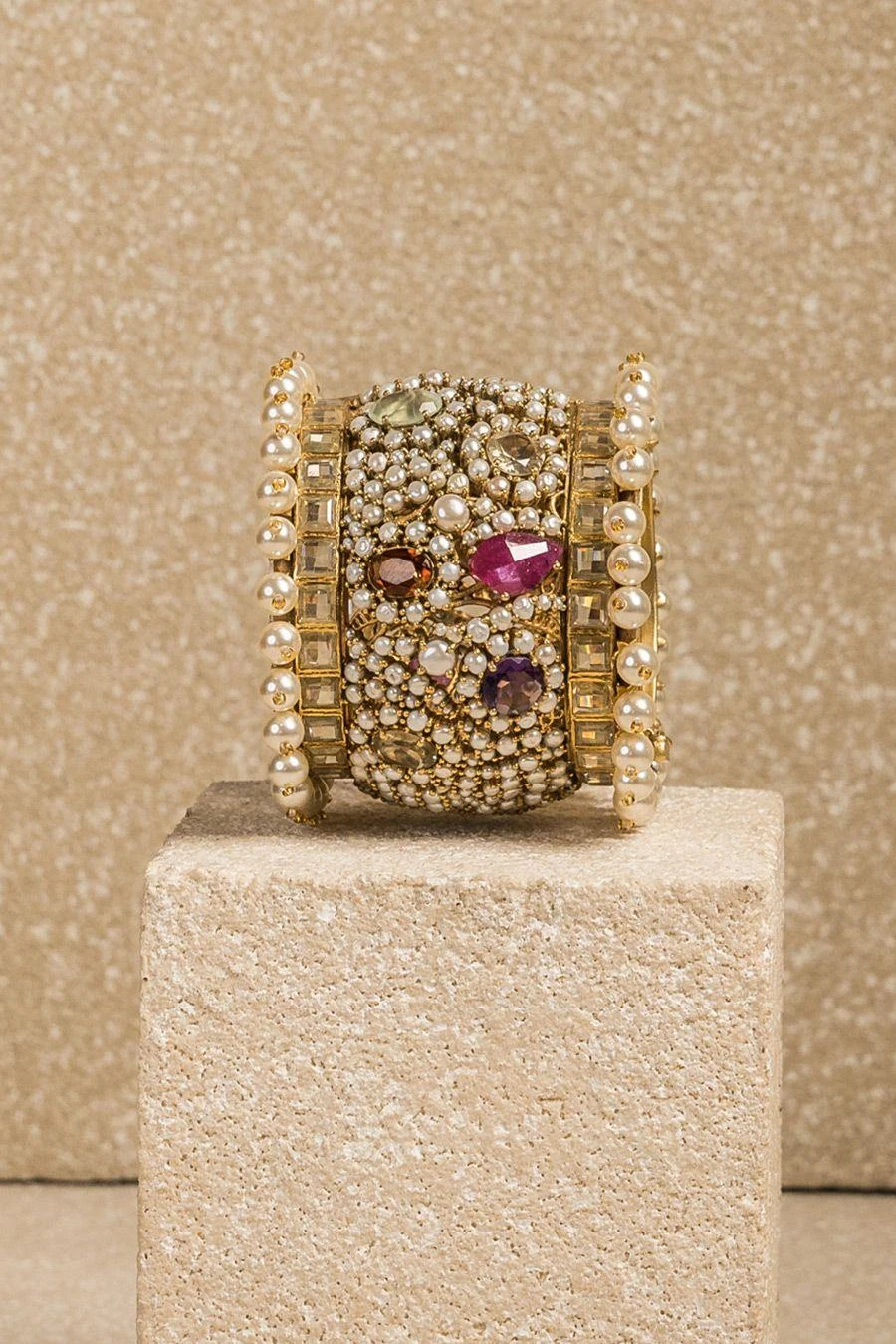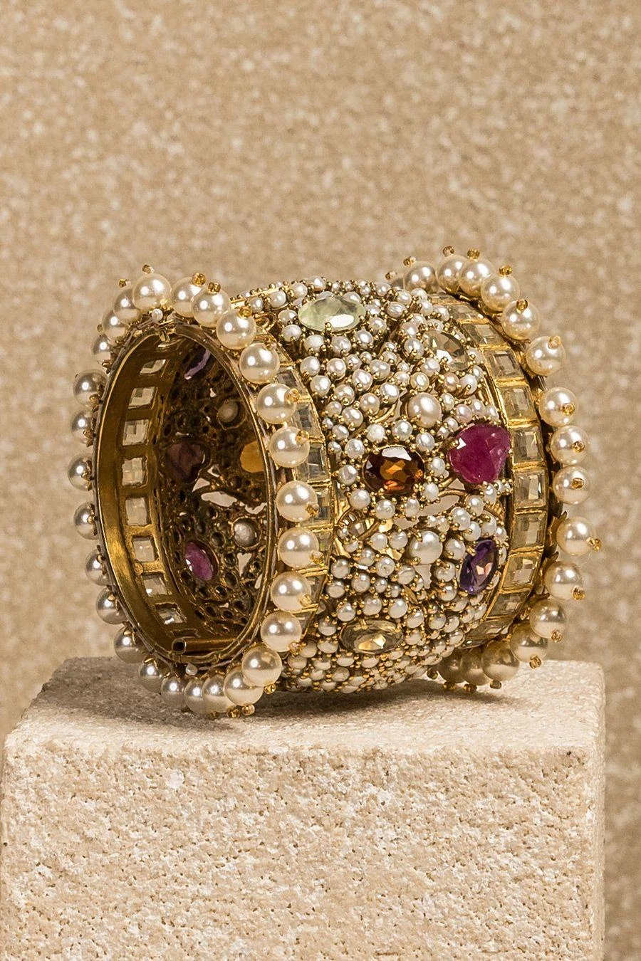 This navarattan kada with fresh water pearl bed is made in 92.5 sterling silver which is dipped with 24k gold polish. The design features Swarovski pearls set in the traditional pacheli style.