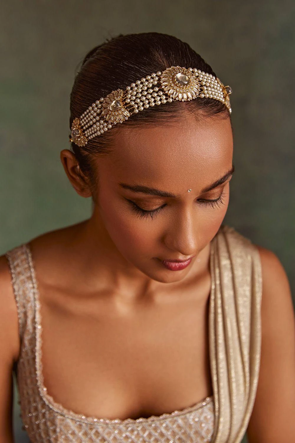 Elevate your elegance with this statement Jadau Hair band. Meticulously crafted in 92.5 sterling silver, dipped in lustrous 24K gold, it showcases intricately set zircons in a captivating floral motif, with a central cabochon zircon.