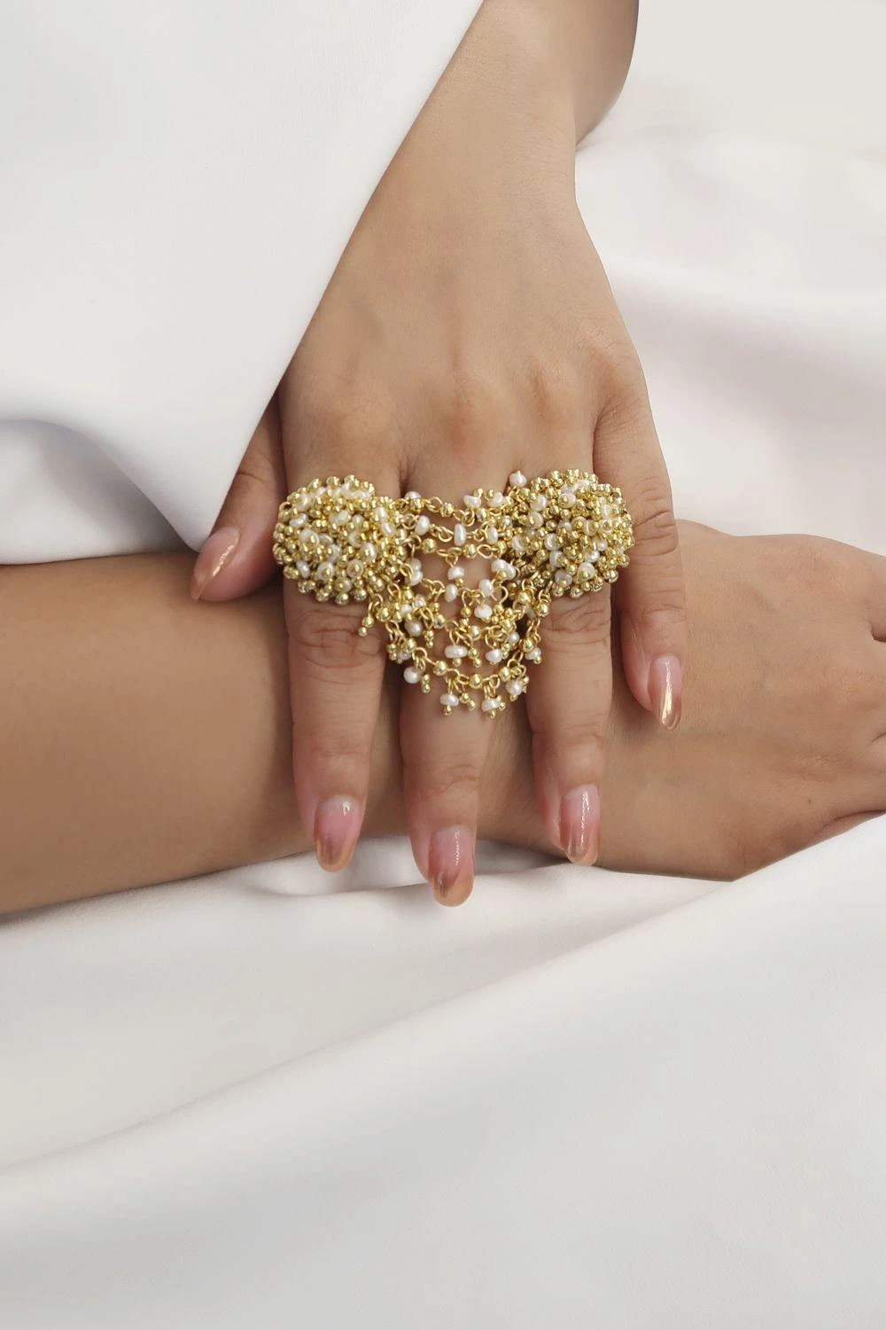 This ornate ring speaks of regality & royalty. It is made from woven beads and pearls on a frame which is attached to multiple strings, giving the ring an alluring appeal. A must have for your haldi/mehendi ceremony.