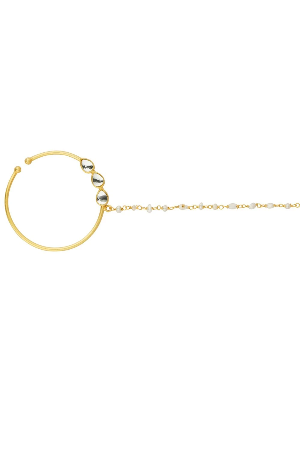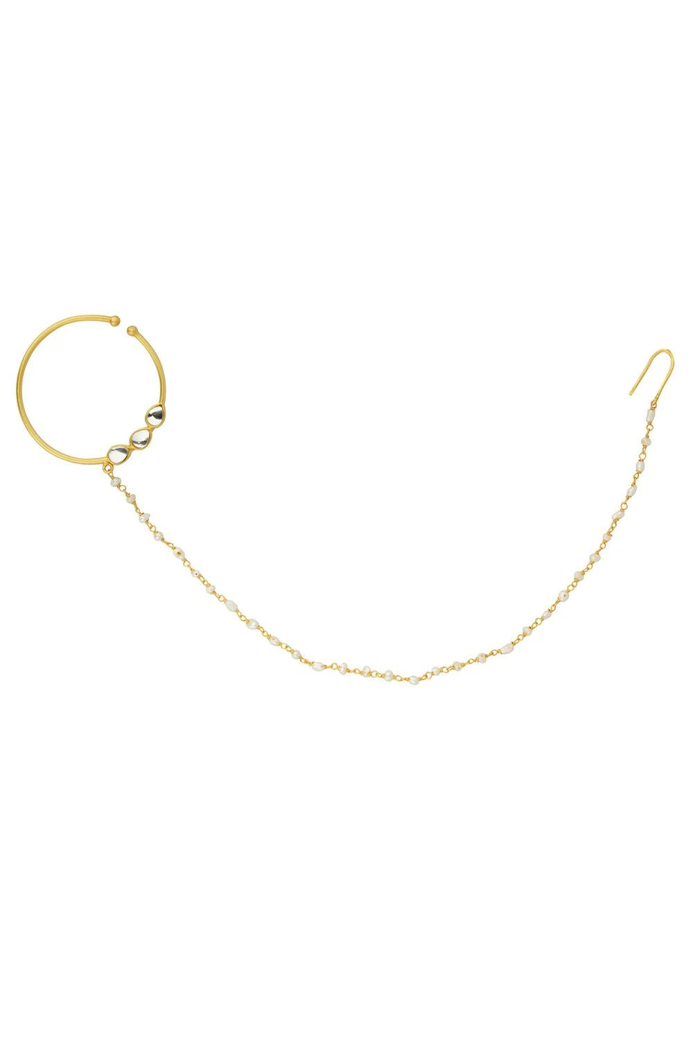 Adorn your bridal look with this elegant nose ring featuring mirror polki details & a pearl chain that gracefully attaches to your hair. It exudes a perfect bridal vibe, adding a traditional touch to your outfit.