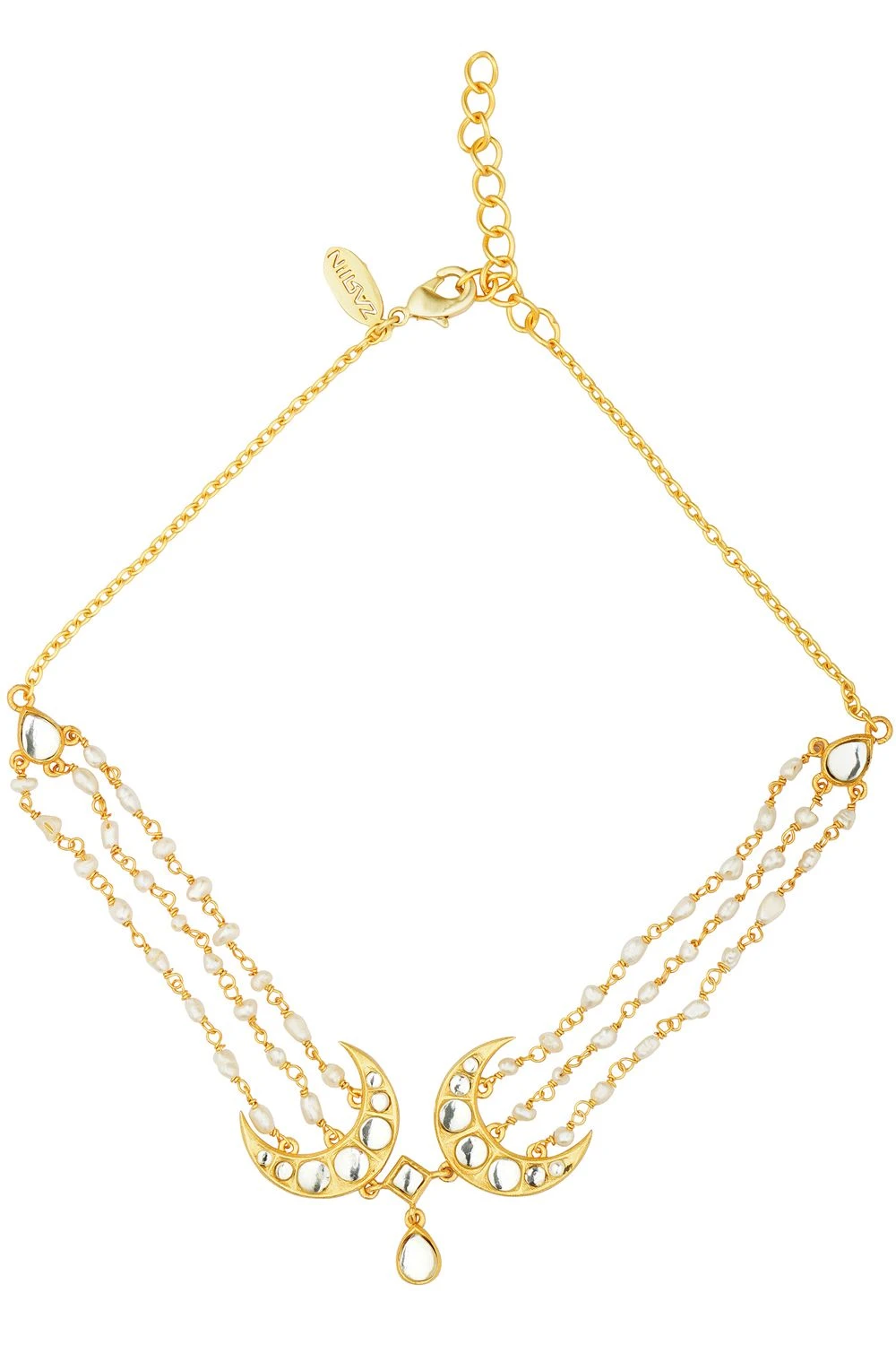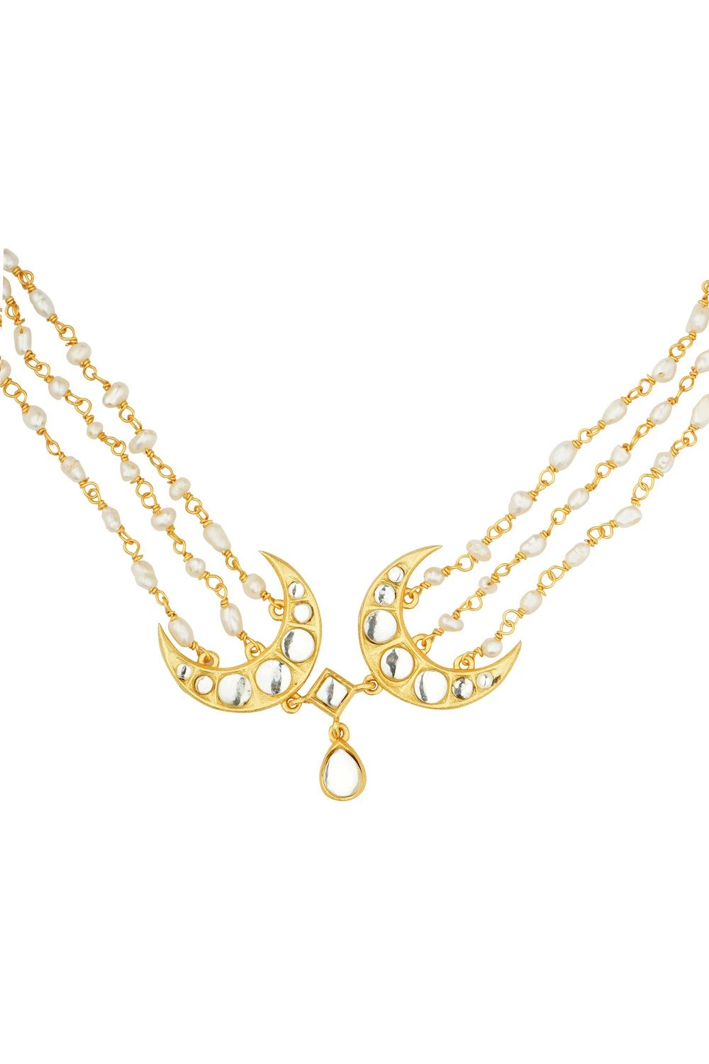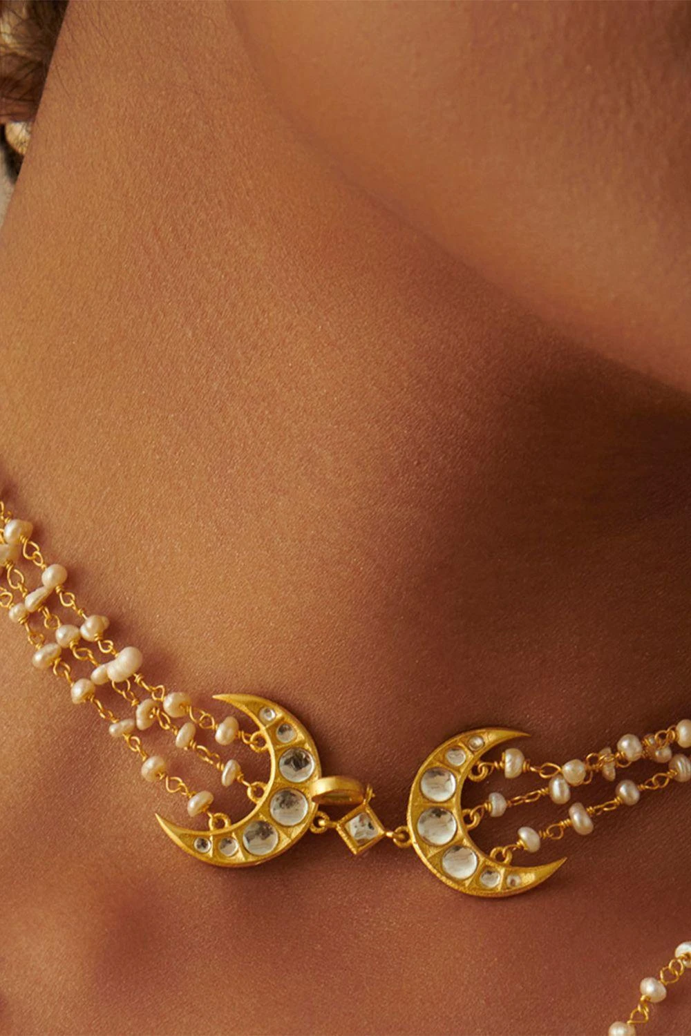 Introducing a captivating choker adorned with delicate strands of freshwater pearls. Its mirror polki chaand motifs add a touch of allure. Crafted from lightweight 22kt gold plating, this minimalistic piece effortlessly elevates any occasion.