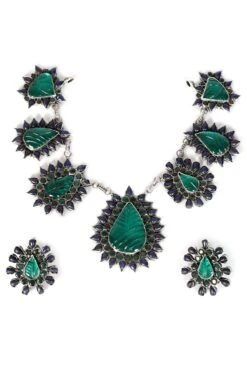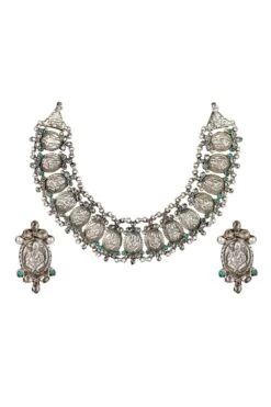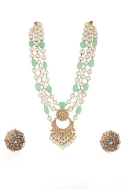 Accentuate your festive looks with this necklace set. Crafted in gold plated brass, this set features a kundan necklace with floral motiffs and is paired with matching earrings.